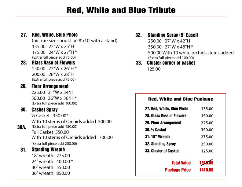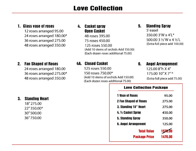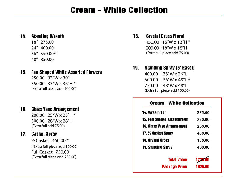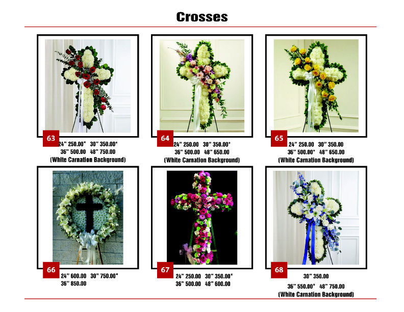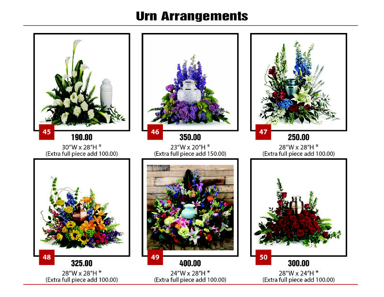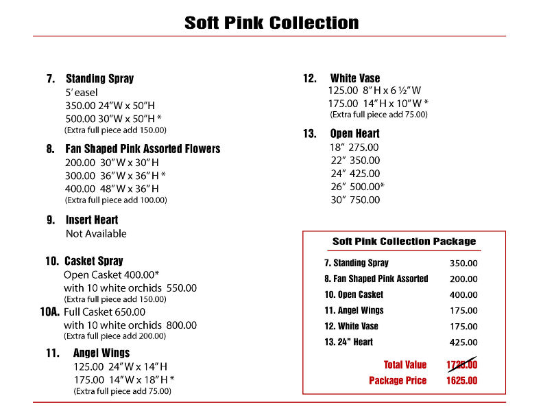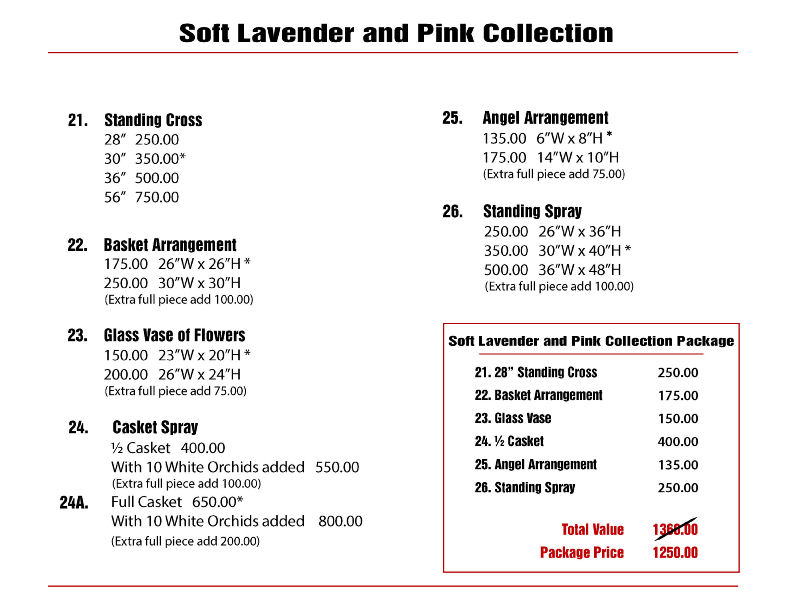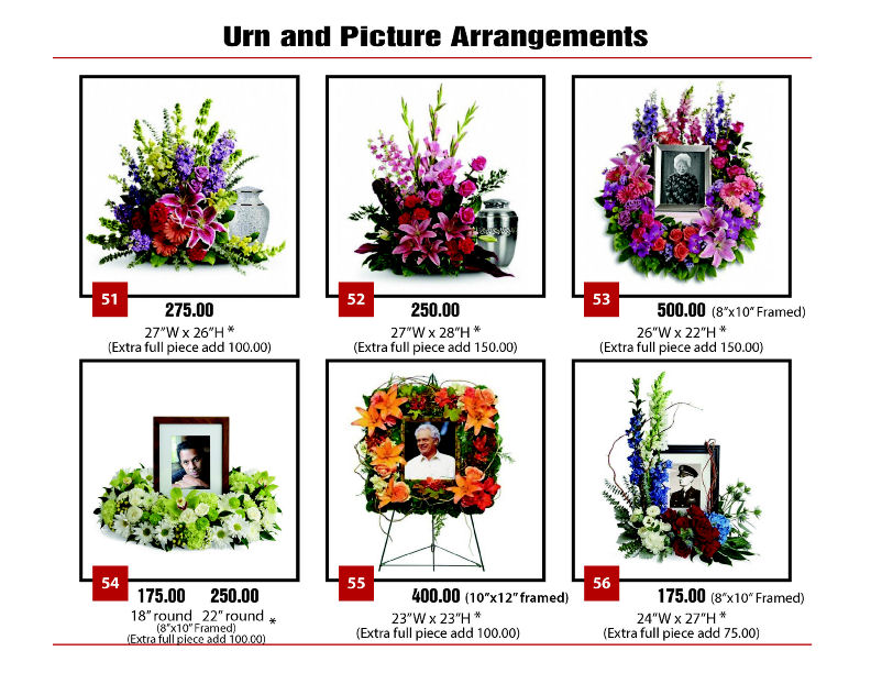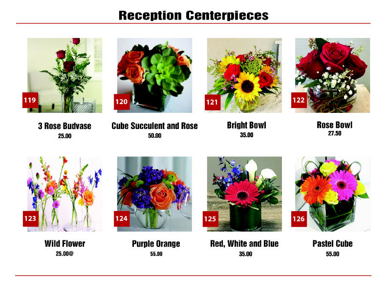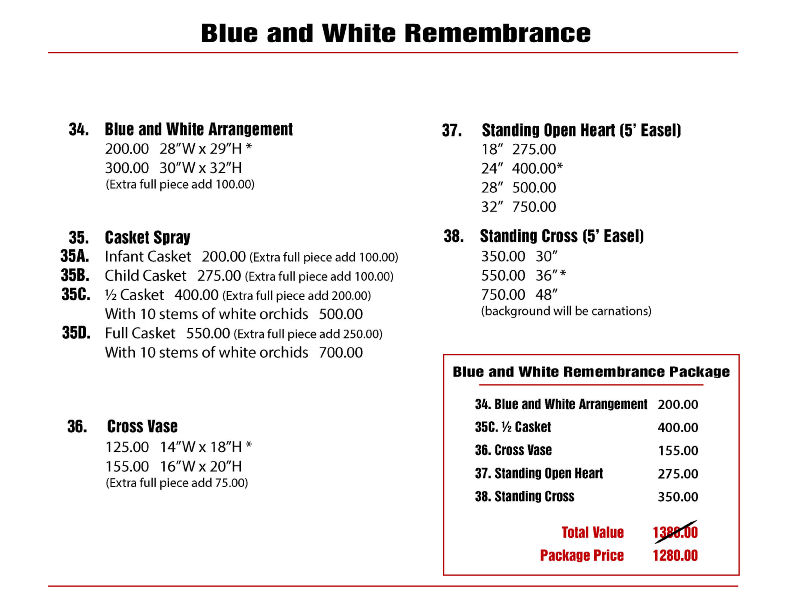 You may choose from the following flower arrangements. Prices are marked next to each arrangement or on the following page.